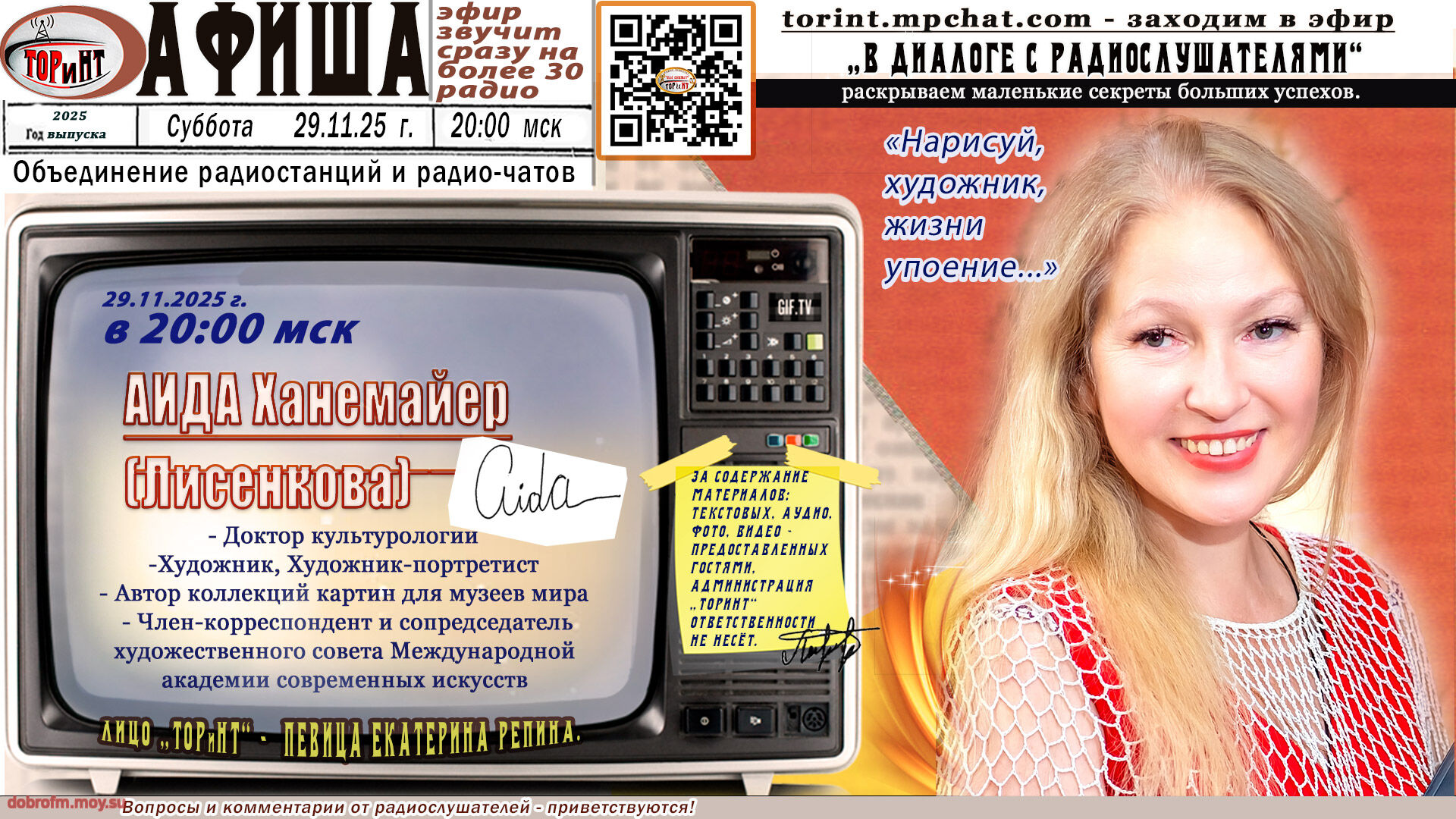 Приятно осознавать, что участники наших прямых эфиров всё чаще рекомендуют своим знакомым получить удовольствие от общения с вами, уважаемые друзья. Аиду пригласила к нам в эфир семейная пара родовых казаков Ольги и Андрея Снетковых-Кутузовых. Не так давно они были в эфире. Как всегда, нам предстоит знакомство с героиней программы, которая одновременно будет транслироваться на более, чем 30 радио-ресурсов. Аида Лисенкова Ханемайер – востребованный художник с творческим псевдонимом АИДА. Она опытный портретист, автор художественных коллекций музейного уровня. Опыт, знания и творческий уровень нашей гостьи, вывел Аиду на высокий уровень общественной деятельности: доктор культурологии, художник-портретист, почётный деятель искусств России, член ТСХР (Творческий Союз Художников России), МОООСХ (Московская Областная Общественная Организация «Союз Художников»), ТСПХ (Творческий Союз Профессиональных Художников), международной академии инновационных технологий и член-корреспондент и сопредседатель художественного совета Международной академии современных искусств, вице-председатель попечительского совета академии. Согласитесь, внушающий список. Ждём вас в эфире, приглашаем к активной беседе. Ведь прямые эфиры «ТОРиНТ», это живое общение между радиослушателями и нашими гостями. На внешней странице сайта МП-Чата "Нас слышат" размещён чат и плеер радиостанции. Если вы зашли с телефона, прокрутите ленту чуть ниже и увидите чат, далее, размещён аудиоплеер радиостанции. Надо нажать на кнопку "PLAY", чтобы оно начало работать. Друзья, чтобы принять участие в прямых эфирах или просто послушать радио, просто переходите по ссылке, указанной. |